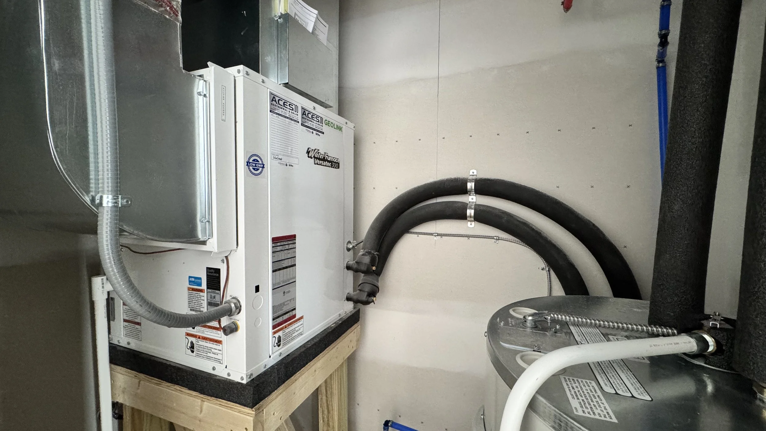 One of the surprisingly small geothermal HVAC units with the water heater under the stairs.
