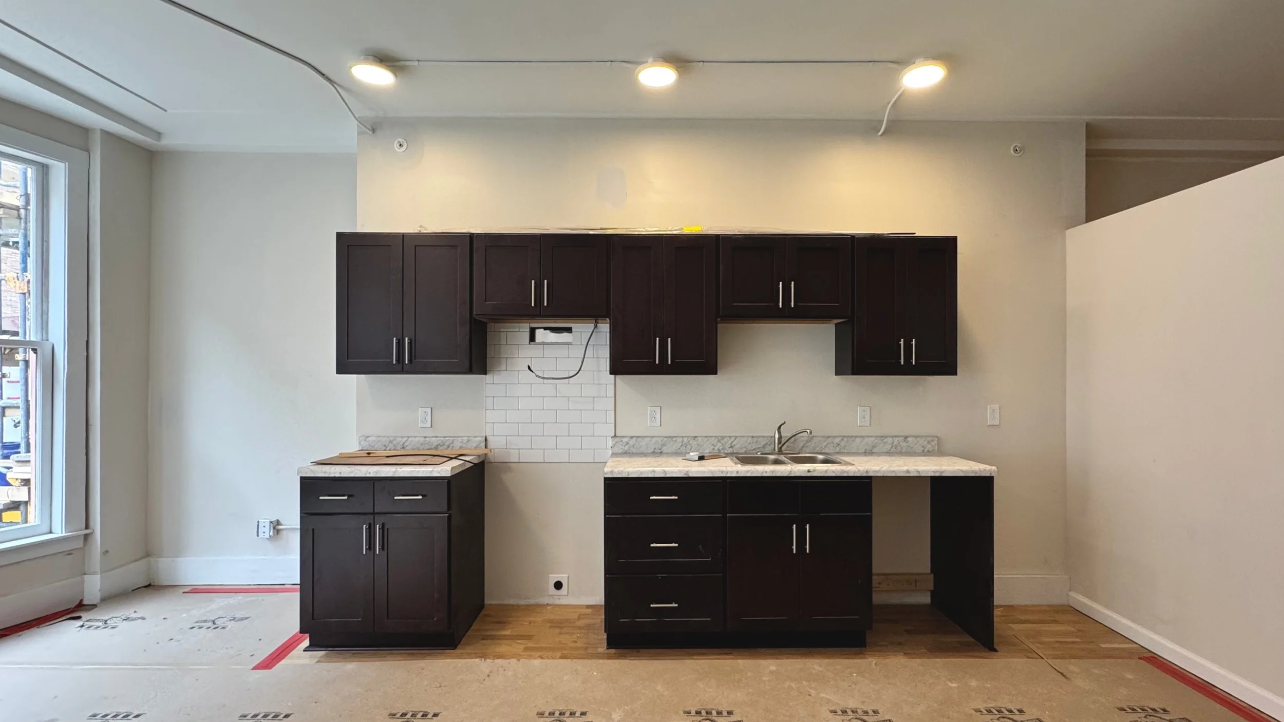 The kitchen of the second floor unit of 5-7 North Clinton. This layout is typical of all 11 units in the buildings.