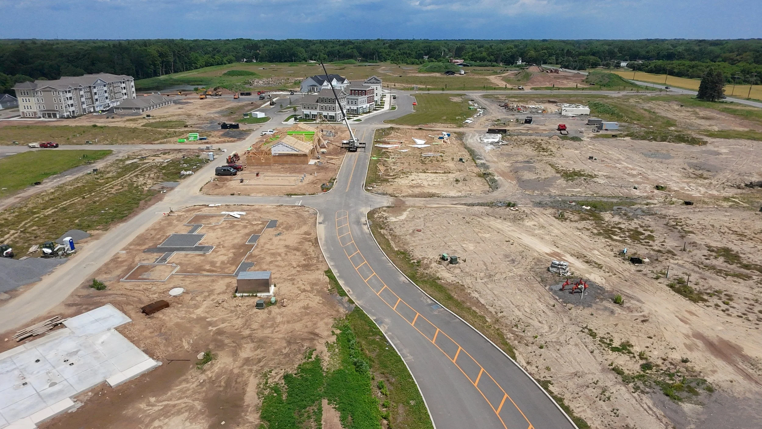 An overhead view of the clubhouse showing the completed pool. The area around the clubhouse will remain largely undeveloped, with just a playground and some pickleball courts planned behind it. Later phases of the project will be built in the distance all the way to Penfield Center Road on the north edge of the development.
