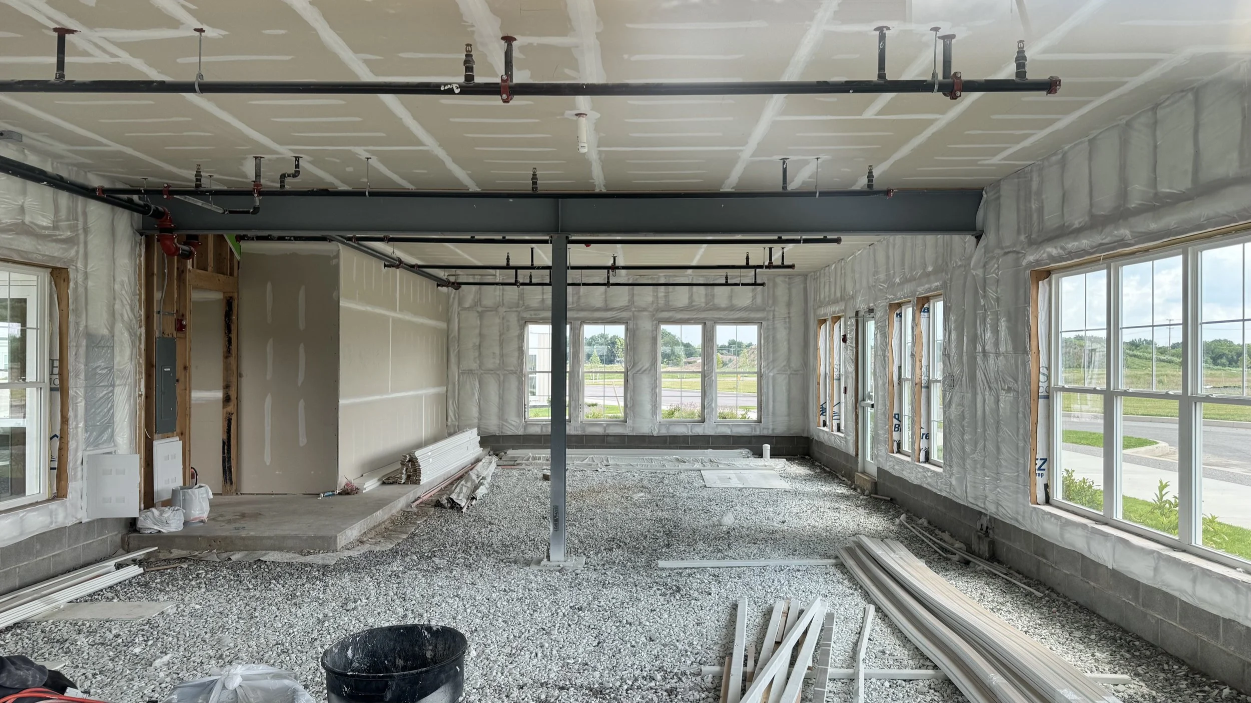 A look at the back corner of the northern mixed-use building on Crossroads Village Trail.
