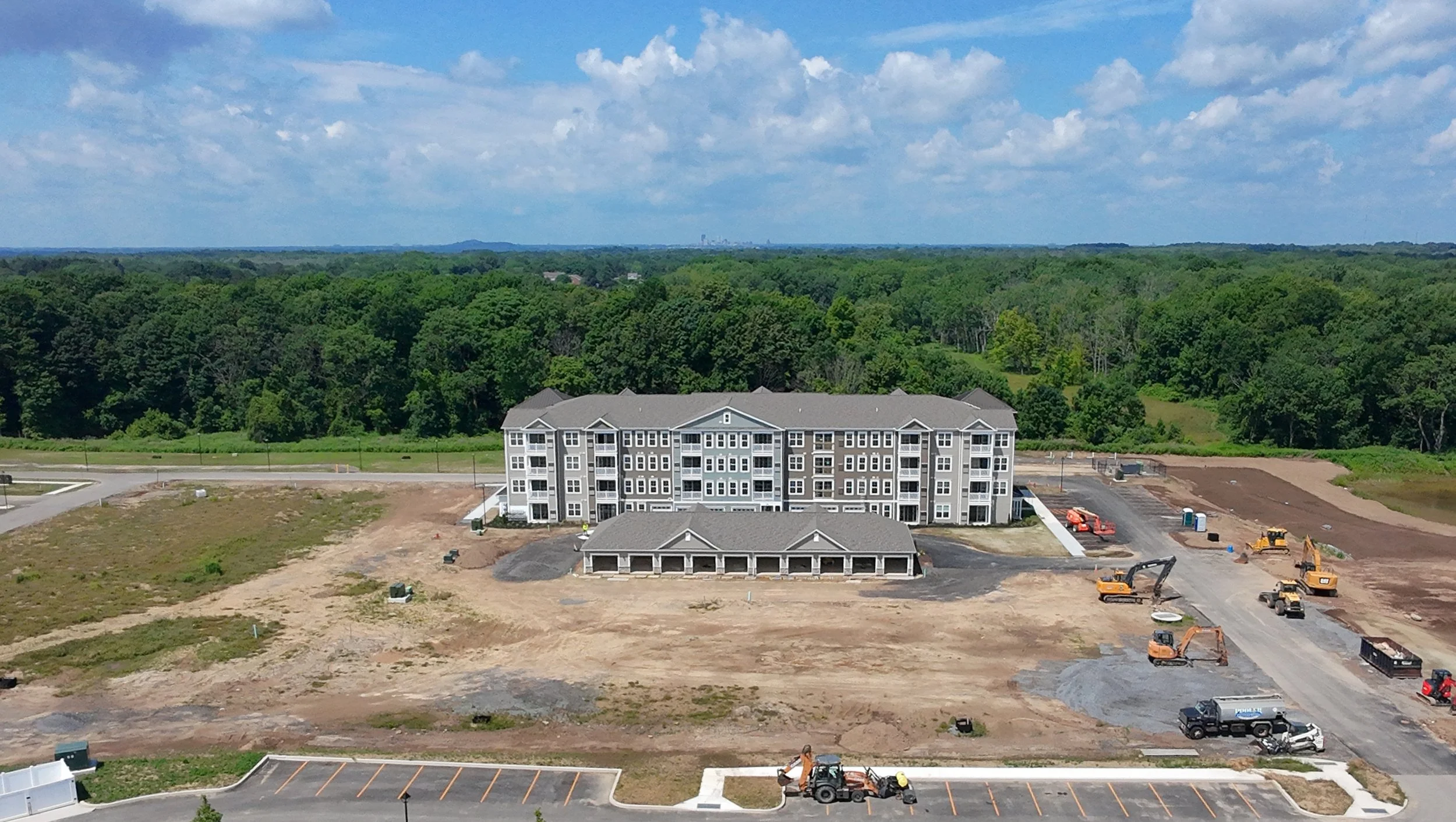 One of the apartment buildings on site looking back towards downtown Rochester in the distance. Initially planned to be a donut shaped-building with a courtyard, it appears that plans have changed to reuse the B1 apartment building design additional times on site. This building matches the out-of-frame to the south (left) building but rotated 180 degrees and with a fourth floor.