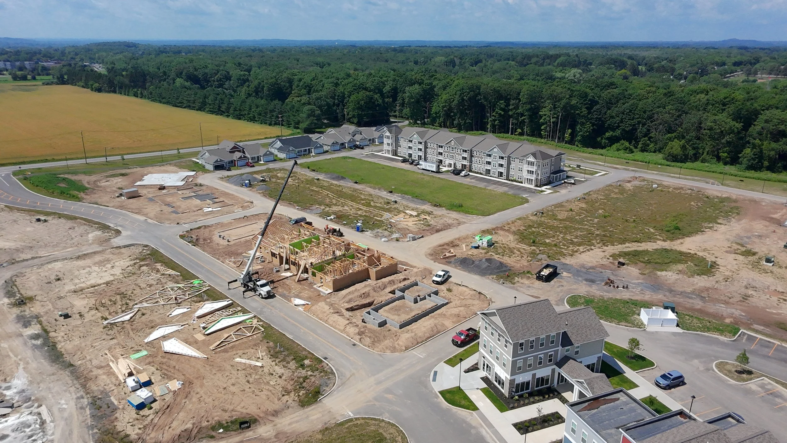 Roof trusses being set on the next group of townhouses under construction along Crossroads Village Trail.