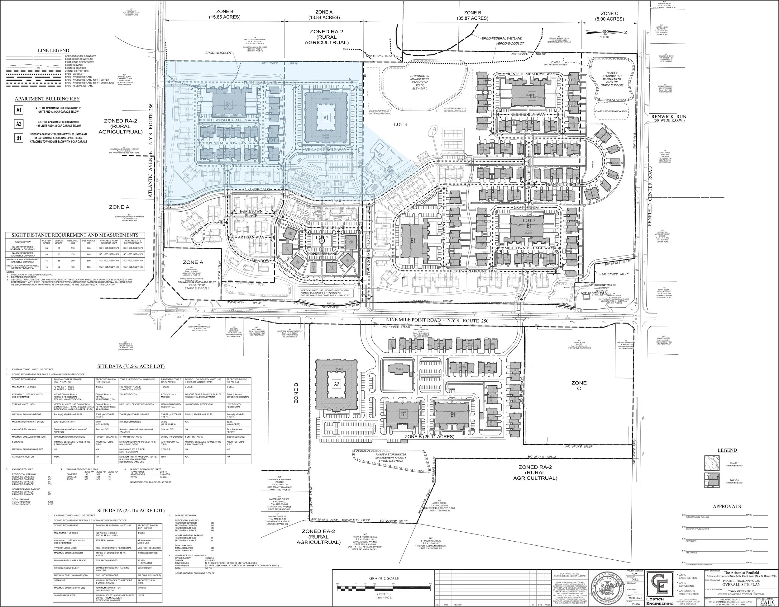 The Arbors at Penfield is a large, mixed use development at the northwest corner of Atlantic Avenue (Rt. 286) and Nine Mile Point Road (Rt. 250) in Penfield. At 772 units of housing across 99 acres, it is likely the single largest multifamily development in the region. The mixed use designation comes from approximately 44,000sf of commercial space mostly in a 2 block long ‘downtown’ at the center of the project.