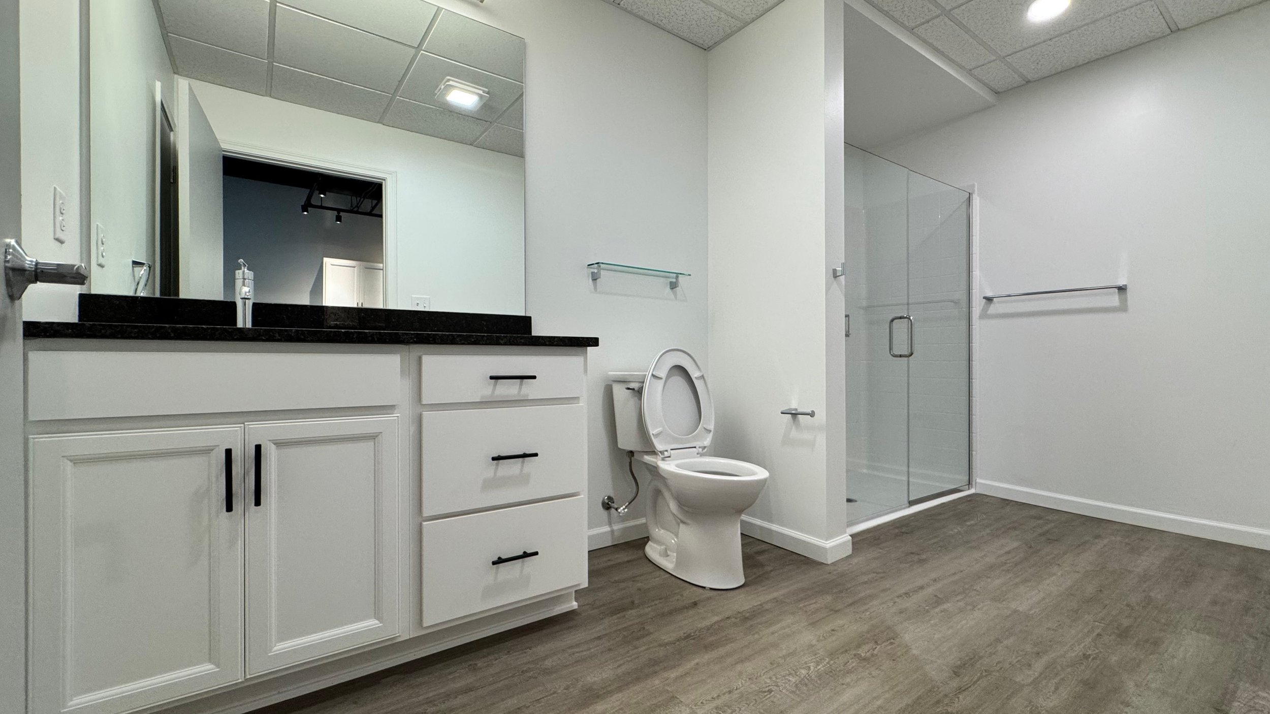 The matching bathroom. Every unit has a glass doored, walk-in shower.
