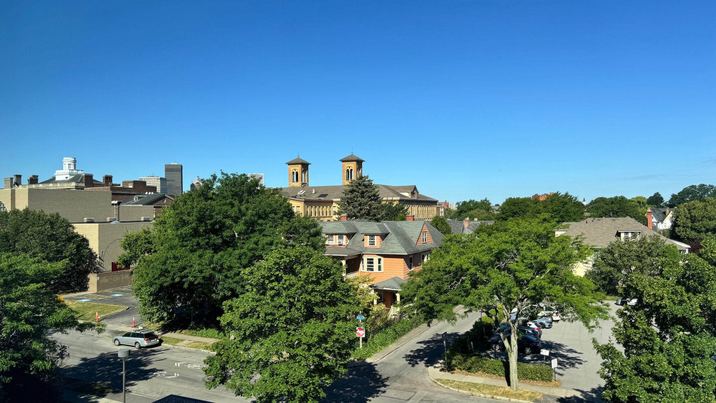 Looking southeast over the new apartments at 50 Prince St. toward the Memorial Art Gallery. The small 3 story building in the middle of the frame, 65 College Avenue, will be Stern’s next apartment conversion.