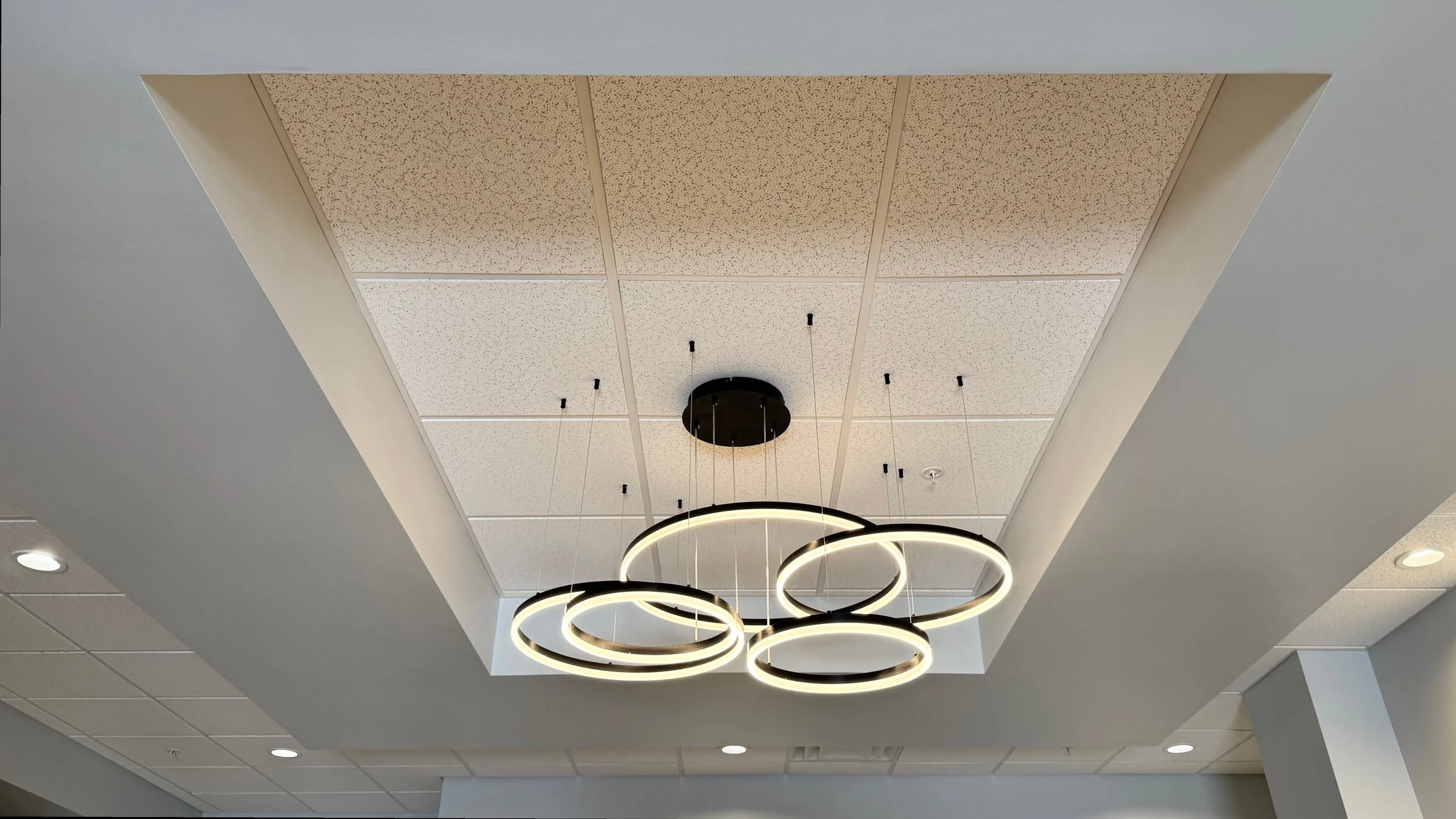 The kitchen in one of the first floor units. All 27 apartments have a modern industrial look with exposed mechanicals and a mix of hanging and track lights.