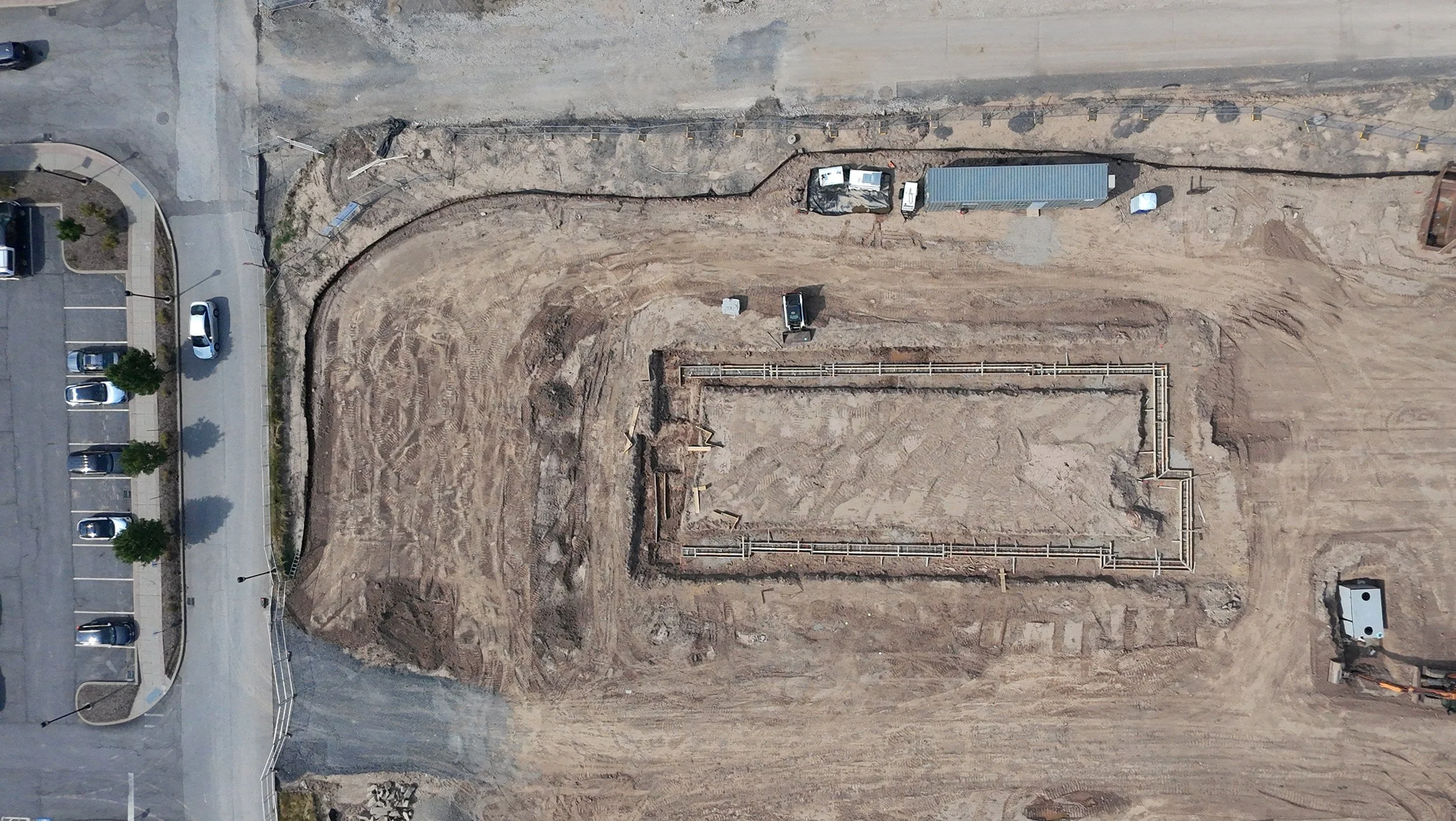 Foundations for the Chick-Fil-A (foreground) and dual branded hotel (background) with the canal beyond.